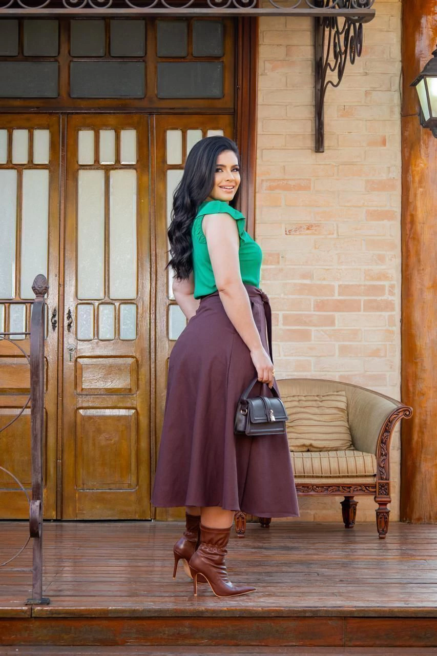 Confeccionada em linho de toque macio e caimento impecável, esta saia midi traduz sofisticação com leveza. Sua modelagem fluida valoriza a silhueta com movimento, enquanto o comprimento midi confere um charme atemporal que transita com facilidade entre o casual chic e o clássico refinado.