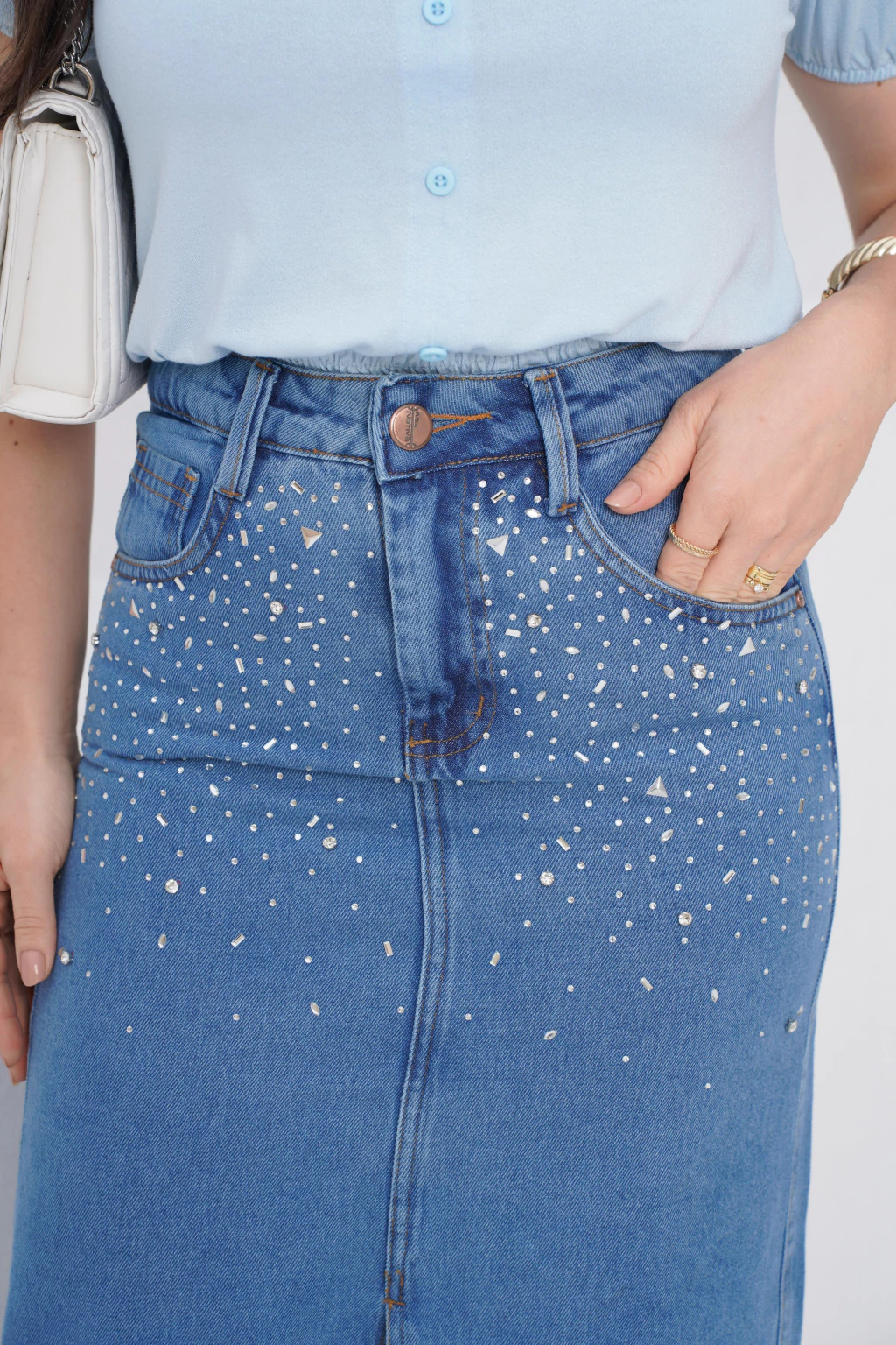Saia Jeans Midi com Fenda Frontal – Elegância e conforto em um só look! Confeccionada em jeans 100% algodão, essa peça traz um toque sofisticado com aplicação frontal e caimento impecável. Ideal para compor visuais modernos e discretos, perfeita para o dia a dia ou momentos especiais.