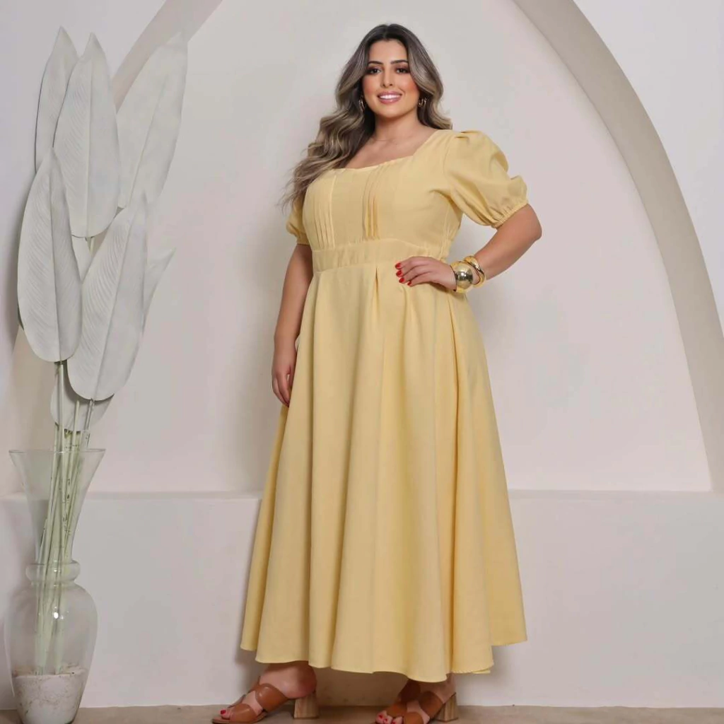 Os detalhes exclusivos, como as charmosas Mangas Bufantes (ou princesa) e o sofisticado Decote Quadrado, são o toque final de romance e modernidade que seu guarda-roupa merece.