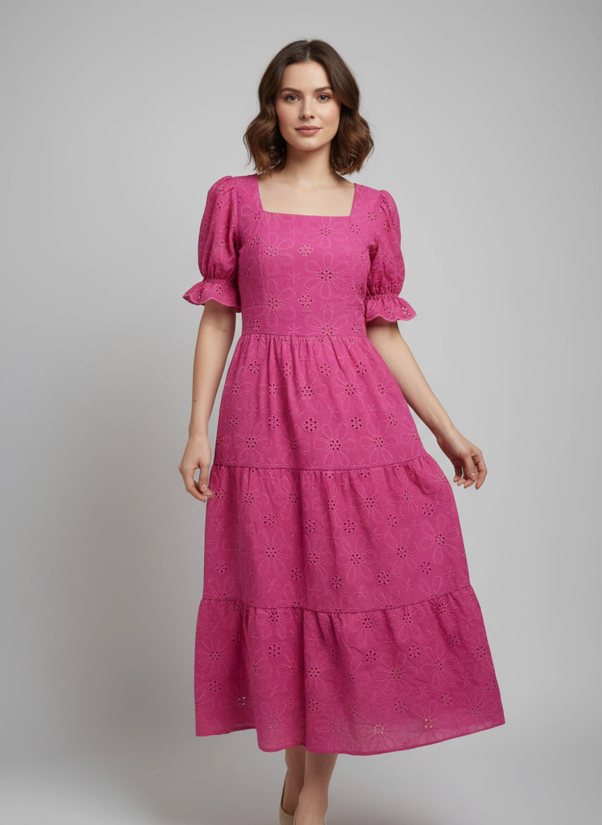 O vestido midi em lese combina delicadeza e sofisticação em uma peça com caimento impecável e toque romântico. Ideal para ocasiões especiais, traz conforto e charme na medida certa. Um clássico que valoriza sua feminilidade com elegância e discrição.