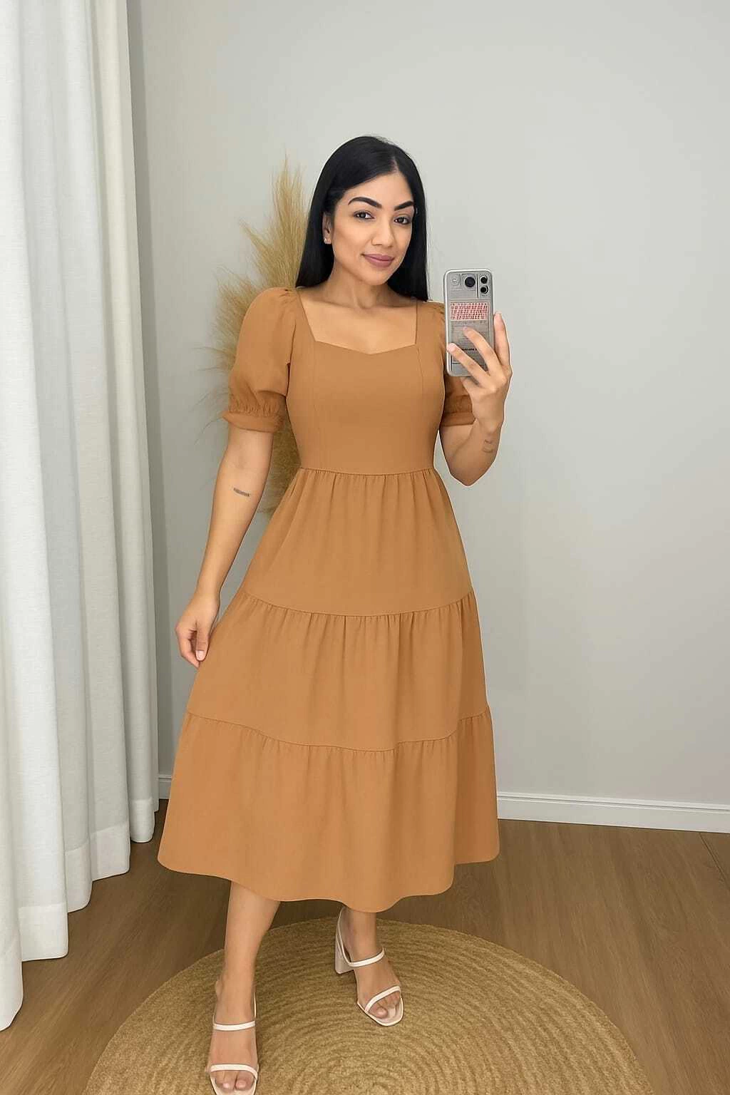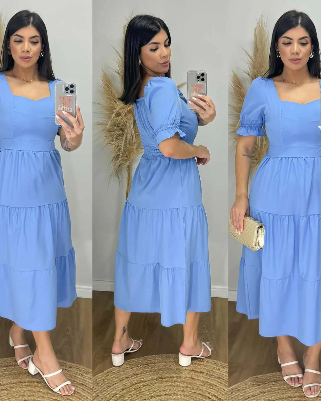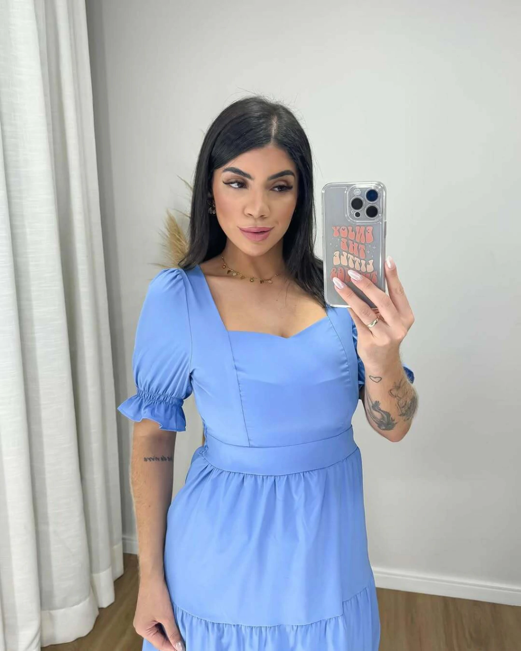 Confeccionado em tecido leve e de alta qualidade, este vestido garante um caimento impecável e um conforto inigualável durante todo o dia. A cintura marcada e a saia em camadas proporcionam um movimento fluido e gracioso, perfeito para diversas ocasiões. Seja para um passeio no parque, um encontro com as amigas ou um evento especial, você estará sempre impecável e à vontade.